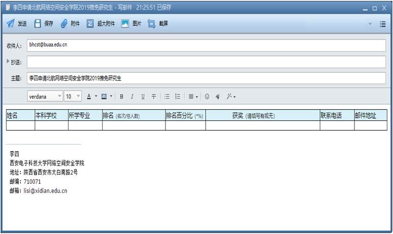 具体办法:4-10项材料制成电子扫描版,与2、3项电子版材料一起压缩,以附件形式发送邮箱:bhcst@buaa.edu.cn;第1项“报名表”填写好后直接“粘贴”到邮件内容页上,邮件主题命名为“×××申请北航英国上市公司3652019推免研究生”。如图: